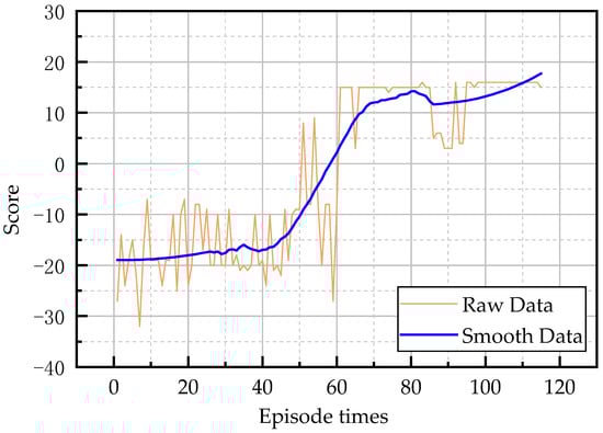 The training results are shown in Figure 16. It can be seen from the figure that when the training reached about 250 times, the score fluctuated around 20 points, indicating that the LHD machine had learned how to reach the middle stage point through the first intersection. When it reached about 1800 times, the LHD machine had successfully learned how to pass the second intersection. When it reached about 2000 times, the score of the LHD machine tended to converge.