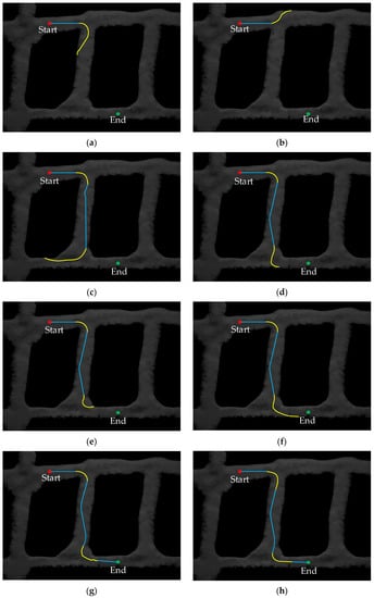 Different stages of TCB-DQN training, the blue line indicates that the LHD machine is controlled by the traditional control algorithm, and the yellow line indicates that the LHD is controlled by the DQN algorithm. (a) LHD machine makes a right turn exploration at the first turning point; (b) LHD machine makes a left turn exploration at the first turning point; (c) LHD machine makes a right turn exploration at the second turning point; (d) LHD machine makes a left turn exploration at the second turning point; (e) LHD machine turned late and hit the tunnel; (f) LHD machine explore a method for turning; (g) although the LHD machine reached the endpoint successfully, the turn at the second turning point was not smooth enough; (h) LHD machine final training track.