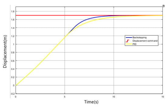 Given the displacement command of 1.7 m and the simulation time of 15 s, the load torque is the sum of the calculated gravity torque and the wind load torque. The simulation comparison results of the electromechanical actuation system under the traditional PID and adaptive inversion controller are shown in Figure 5. When the displacement is 1.7 m, the system can reach the system displacement command in 9.8 s under the adaptive inversion controller with a relative error of 0.012%, while it is stable in 12.4 s under the traditional PID control, with a relative error of 0.71%.
