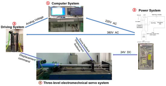 This paper builds a three-level electromechanical servo system test bench based on LABVIEW, as shown in Figure 8, the test bench consists of four parts: ① computer system, ② power supply system, ③ driving system, and ④ electromechanical servo system. ② Supply required voltage to ①③④. After the system runs, the sensor in ④ feeds back the force and displacement signals to ①, and outputs the analog voltage to ③ after being calculated by the control algorithm in ①, so as to generate the three-phase voltage corresponding to the target displacement to control the movement of ④. The self-adaptive inversion control technology designed in this paper has high precision requirements for the motion of the control object, and the small- and medium-sized servo motors were selected as the control object. According to the motion control index of the test bench, the jarrett AC servo motor was selected with a rated power of 820 W, a rated speed of 3000 rpm, and a rated torque of 2.6 N·m. The lead of the actuating cylinder used in the test was 5 mm, the number of stages was three, the maximum stroke was 1800 mm, the maximum extension speed was 100 mm/s, and it could push a load of 800 N.