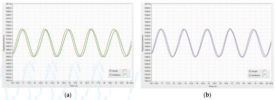 Afterwards, the sinusoidal signal tracking experiment was carried out. The sinusoidal test can effectively test the followability of the controlled target to the command and measure the control effect of the adaptive inversion strategy. The output end of the multilevel electromechanical servo system was connected to a spring load, the system was powered on, the host computer gave a sinusoidal displacement command, and set the corresponding offset, so that the EMA ran in the range of 1100~1900 mm, 1300~1700 mm, 1400~1600 mm, 1420~1580 mm, respectively. Inside, the corresponding frequencies were 0.05 Hz, 0.1 Hz, 0.2 Hz, and 0.5 Hz, respectively. Figure 9 shows the comparison of the traditional PID and the adaptive inversion method at a frequency of 0.5 Hz, and the comparison data at different frequencies are summarized in Table 3.