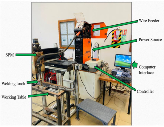 Bead-on-plate trials were deposited by the GMAW process using metal-cored wire on 1.25 Cr-0.5 Mo substrate. The Metalloy 80B2 (Hobart Brothers (TRI-MARK) company) wire with a diameter of 1.2 mm was used for investigation. Metalloy 80B2 is a metal-cored wire that was used for single or multi-pass welding of chromoly steels. The shielding gas of 98% Ar and 2% O2 was used. The chemical composition of the base plate and wire are as shown in Table 1. The experiment was conducted on a PRO MIG-530 GMAW setup (Miller). Figure 1 represents the complete arrangement of the experimental setup used in the present study. This setup includes a wire feeder, power source, computer interface, automated nozzle controller, welding torch, working table, shielding gas cylinder and a special-purpose machine. The computer interface helps to run the code designed for a particular bead deposition. The code was directly linked with the automated controller, which controls the movement of the nozzle in X, Y and Z directions. Before initiating any program, shielding gas was provided through the setup so that the deposited material does not come in contact with any atmospheric gases. The base metal was clamped from both sides and the material was deposited with the help of the torch, which has the flexibility to move in any required direction. To measure the temperature around the heat-affected zone, a thermocouple was installed between the base plates.