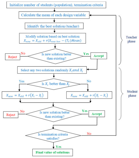 The TLBO algorithm developed by Vivek and Vimal [28] works on the viewpoint of teaching and learning among the teacher and student inside a classroom. The global optimal solution was achieved in TLBO via populations of solutions. Students in the classroom represent the population. Different offered subjects to the students depict the constraints during the implementation of TLBO. The fitness values do not have any meaning, but the marks obtained by students and the student in the entire class who obtains the highest mark is characterized as a teacher. During the implementation, a teacher make an effort to bring the outcomes of the remaining students close to the student who has secured the highest marks by shifting the mean of marks of that student. Two essential elements of the TLBO algorithm comprise (a) the teacher phase where the students learn from the teacher; (b) the learner phase where the students interact among the learners. Figure 3 depicts the stepwise methodology for the implementation of the TLBO algorithm.