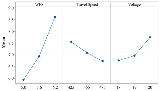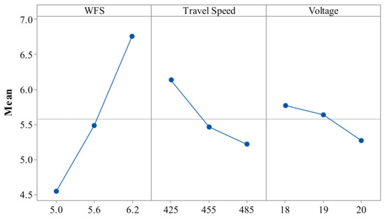 The main effect plot shown in Figure 4 for BW explains the trend that was followed by varying the wire feed speed, travel speed and voltage of deposited material. The graph shows that there was a decrease in BW as travel speed increased. The reason was due to the speed at which the torch deposits the material. As the speed of the torch increased, there were fewer drops of molten metal being deposited, which resulted in a decrease in the BW of the weld bead [27]. Moreover, the trend for voltage shows an increase in BW of the weld bead. The reason for such an increase in width was due to the widening of the arc, which results in bigger droplets of molten metal being deposited [32]. Hence, a positive effect can be observed on the BW of the weld bead. Increasing the WFS has a negative effect on width as BW increases. The reason for such an increase in BW was due to the speed of wire coming out from the nozzle and the higher amount of material being deposited [33].