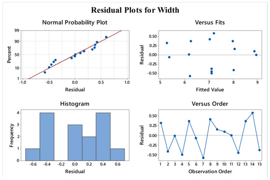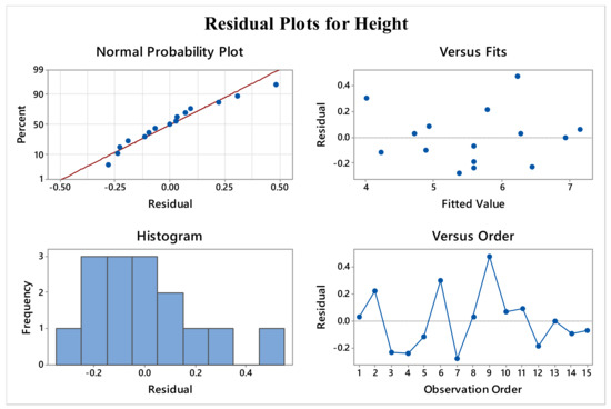 Residual plots depict the validation of the satisfactory results of the ANOVA. The ANOVA analysis is considered to be valid and suitable for the selected model, provided it satisfies some assumptions [37]. For this purpose, validation of the residual plots is very important. Figure 6 shows the residual pot for BW. It contains four plots. The normality plot represents linear development. It suggests the suitability of the model. The second plot of versus fits has shown that fits were entirely randomized around the source. The histogram plot depicts a bell-shaped curve that indicates the supportive data for good ANOVA. The absence of any particular trend for versus order plot verifies the ANOVA statistics. According to this, all four plots validated the ANOVA statistics for a better prediction of future results. Similar observations were obtained for BH as per Figure 7. This showed that all four plots successfully validated the ANOVA statistics for a better prediction of future results of BW and BH.