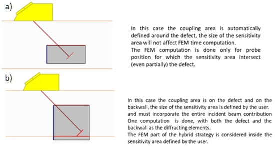 The 3D hybrid FEM model is a coupling method [42] between an FEM scattering model with a ray-based asymptotic field model (the CIVA pencil method for field computation [2]). This hybrid methods consequently consists of simulating the propagation field until the defect vicinity employing the CIVA pencil method [50] and then the scattering of this field from the defect thanks to a numerical approach. The flaw’s echographic signal is finally obtained by the way of the Auld’s reciprocity principle [51], which expresses it as a combination of fields from the emitter and receiver with and without a scattering defect. The numerical solver is built upon a “dedicated” high-order spectral finite element method [43,44], which enables us to address 3D configurations, and second, the constitution of the numerical parameters are automatically deduced from the inspection configuration. A theoretical description of the hybrid FEM method is given in Appendix A. Some additional details (meshing around the defect, numerical scheme, etc.) can be found in [41,52]. Different calculation strategies adopted in the CIVA 2017 release used in this paper depend on the defect’s location (embedded or surface breaking) and on the sensibility area defined by the user to reduce the computation time. For breaking flaws, the coupling reciprocity integral [51] is carried out on both the flaw and component surfaces inside the sensibility area (in red in Figure 1b).