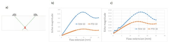 The first numerical comparison of models consists in studying the effect of the flaw extension on maximal flaw echo amplitude (Figure 2b). For both the 0.5 mm and 5 mm high cracks, very important differences are observed between the FEM and PTD models in terms of maximal echo amplitudes. Such differences are more important for the smallest height. Nonetheless, for the 5 mm height differences are not negligible even for large extensions for which the echo magnitude tends to stabilise (25 mm is close to the beam width). For this 5 mm height, the echoes from the top and bottom edge are well dissociated, and the amplitude noticeably oscillates as a function of the extension for the FEM model. These oscillations may be due to interference between waves scattered from each edge and their corners, the latter being better predicted by FEM than by the PTD model. The PTD model used here relies on the incremental Huygens model to account for the finite edge extension [16,26,53,54].