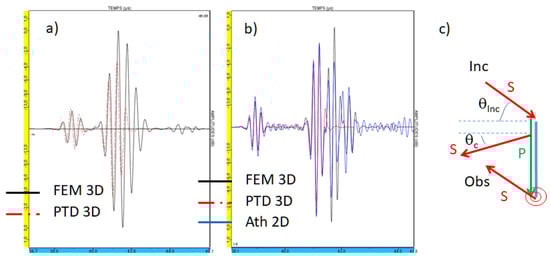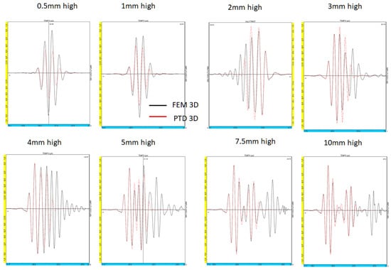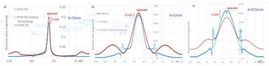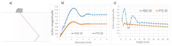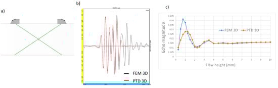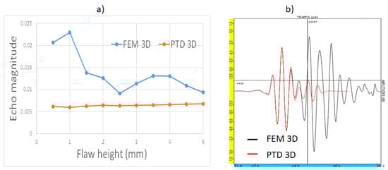 As seen in Figure 17a, the FEM model leads to the better prediction. The gap between PTD and FEM reaches 8 dB at 0.5 MHz, PTD losing its effectiveness for small flaw heights with respect to the wavelength. The prediction of the echo signal also seems better when using the FEM model (Figure 17b,c).