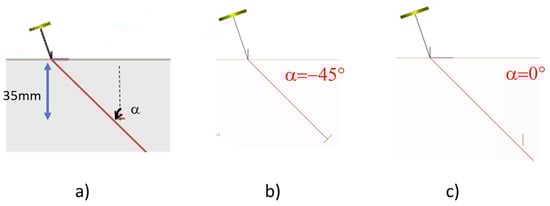 (a) pulse echo configuration with the SV45° wave at 5 MHz of a rectangular defect of varying height (5 mm here—red segment), 0.5 mm extent and various tilts; (b) α = −45°, specular reflection configuration; (c) α = 0°, classical configuration of a vertical flaw.