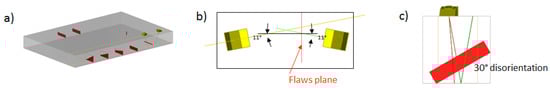 Several notches and holes have been fabricated in a planar specimen (Figure 10a). In order to study the influence of the orientations of both probes and flaws, two 6.35 mm diameter probes emitting 45° P-waves at 2.25 MHz have been positioned in a TOFD configuration with a 60 mm Probe Center Separation and rotated from the 0° skew angle to the 34° skew angle. Figure 10b,c present a typical case of the 11° skew.