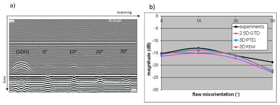 (a) Experimental B-scan obtained when scanning the side drilled hole (SDH) and the three defects (with vertical misorientation of 10° to 30° for the top edge); (b) validation of the 2.5D GTD, 3D PTD and the hybrid 3D FEM models against the measured echoes from the top tip of misoriented backwall breaking flaws.