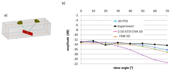 The differences between the 3D PTD model, the hybrid 3D FEM model and experimental data are less than 1 dB, except for the 30° misoriented flaw, for which the signal-to-noise ratio is low (see Figure 11b). Note that the 3D PTD-based model provides a slight improvement over the 2.5D GTD model in that configuration.