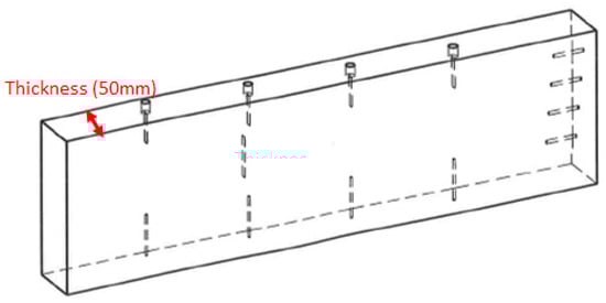 The component used for the following experimental validations is described in Figure 13. The thickness of the specimen, which is the depth to be inspected in experiments (see Figure 14b for an example of inspection configuration), is indicated in red in Figure 13.