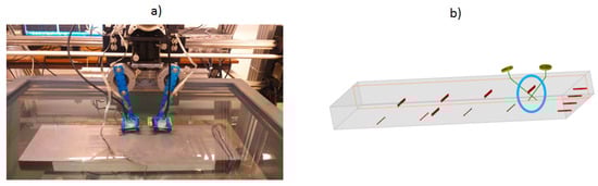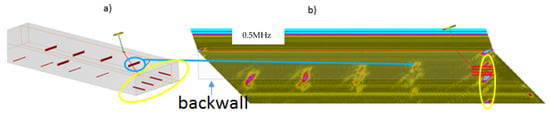 (a) Configuration of ultrasonic pulse echo NDT of the embedded planar electro-eroded slots (depicted in Figure 13); (b) experimental True BScan using the immersion probe at 0.5 MHz. The entry surface and backwall of the component are indicated in grey. The slot utilized for validation is shown thanks to the blue arrow, whereas the yellow ellipse indicates the component right corners and the flat bottom holes.