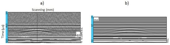 For the TOFD P45° waves inspection at 1 MHz: (a) experimental Bscan; (b) Bscan simulated using the 3D hybrid FEM model in simulation.