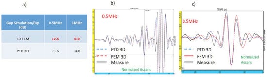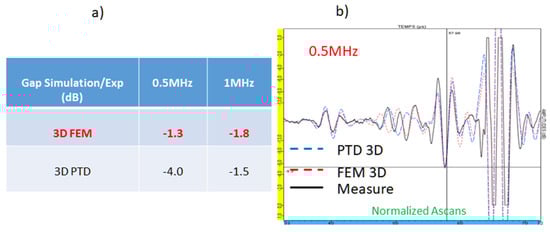 (a) Gap between simulation and experience for the 3D hybrid FEM model and for the 3D PTD model; (b) Superimposition of the normalized experimental and simulated AScans at 0.5 MHz.