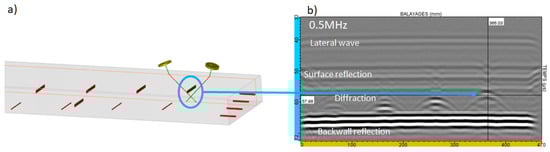 (a) S45° TOFD immersion inspection of several embedded planar electro eroded slots; (b) experimental BScan obtained when scanning the notches and the flat bottom holes at 0.5 MHz.