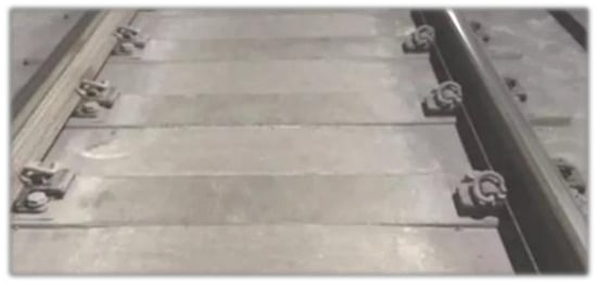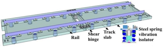 For special places with high vibration damping requirements, subway lines generally adopt a steel-spring-floating slab track structure, as shown in Figure 2. Its components include generally a concrete base, a steel-spring vibration isolator, a reinforced concrete floating slab, and fasteners. In this structure, elastic supports are added between the concrete bottom slab and the reinforced concrete floating slab [7,8,9,10]. The elastic support has a certain adjustment flexibility. Both sides of the floating slab are fixed with elastic materials, and the rail is fixed on the floating slab with fasteners. At the same time, in order to ensure the coordination of the overall rigidity of the floating slab track, shear hinge devices are also provided at the ends of the two floating slab tracks [11,12].