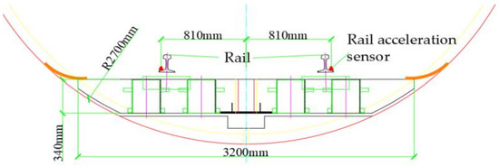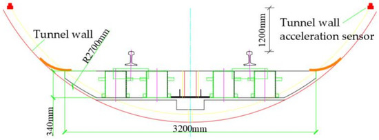 According to the above test plan, the time of the “train stops” is selected to arrange the displacement and acceleration sensors in the four working condition segments. The layout of on-site measuring points is shown in Figure 8. For the range of the acceleration sensor, the rail acceleration adopts 2000 g acceleration sensors, the track bed acceleration adopts 25 g acceleration sensors, and the tunnel wall acceleration adopts 0.5 g acceleration sensors. The sensitivities of the three types of sensors are 5 Mv/g, 200 Mv/g, and 10,000 Mv/g, respectively; the resolutions are 8 mg, 0.2 mg, and 0.002 mg, respectively.