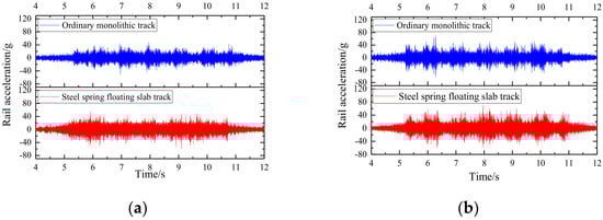 Comparison of vertical acceleration of track bed. (a) Straight line segment; (b) curved segment.