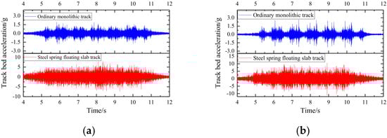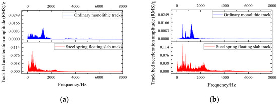 (2) Comparing the waveform diagrams in Figure 13 and Figure 14, it can be seen that the vibration acceleration waveform of the track bed is consistent with the waveform of the rail, where the position of the peak point is the same as the shape change law of the waveform, indicating that the transmission efficiency of the fastener for each frequency band of the rail acceleration is similar. However, the amplitude of the waveform of the steel- spring-floating slab track is significantly larger than that of the ordinary monolithic track. The reason is that the bottom of the steel-spring-floating slab track is suspended, and its constraints are less, and the stiffness of the vibration isolator is also maintained at a smaller value, with the result that the acceleration of the track bed of the steel-spring-floating slab track is significantly greater than that of the ordinary monolithic track. In Figure 14a, the maximum peak values of the acceleration amplitudes of the track bed of the ordinary monolithic track and the steel-spring-floating slab track are located at 1290.93 Hz and 432.79 Hz, respectively, and their amplitudes are 0.012 g and 0.097 g, respectively. In Figure 14b, the maximum peak values of the acceleration amplitudes of the track bed of the ordinary monolithic track and the steel-spring-floating slab track are located at 1249.33 Hz and 442.39 Hz, respectively, and their amplitudes are 0.015 g and 0.131 g, respectively. It can be seen that the peak positions of the acceleration spectrum of the track bed under different line conditions are very close, but the amplitude of the curved segment is larger than that of the straight line segment.