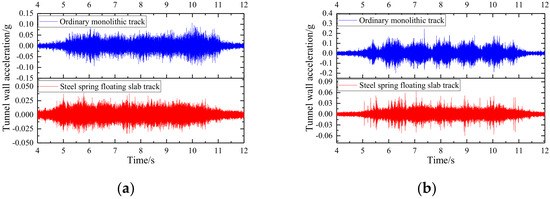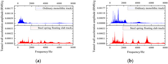 (3) Since the acceleration amplitude of the tunnel wall reflects the impact of train vibration on the environment, it is also the key to evaluating the vibration damping effect of the track structure. According to Figure 15, the peaks of the acceleration amplitude spectrum of the tunnel wall in the tunnel wall at the steel-spring-floating slab track segment are significantly smaller than those in the ordinary monolithic track segment, especially the frequency band below 2500 Hz is greatly weakened. In Figure 15a, the maximum peak values of the tunnel wall acceleration amplitudes of the ordinary monolithic track and the steel-spring-floating slab track are located at 442.86 Hz and 1541.73 Hz, respectively, and their amplitudes are 8.57 × 10−4 g and 1.44 × 10−4 g, respectively. In Figure 15b, the maximum peak values of the tunnel-wall acceleration amplitudes of the ordinary monolithic track and the steel-spring-floating slab track are located at 1213.73 Hz and 1888.33 Hz, respectively, and their amplitudes are 1.7 × 10−3 g and 3.21 × 10−4 g, respectively. It can be seen that the vibration isolator of the steel-spring-floating slab track can effectively isolate and filter the frequency band below 2500 Hz, and its built-in damping structure can greatly consume the vibration energy, thereby reducing the vibration wave transmitted to the tunnel wall.