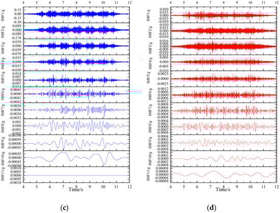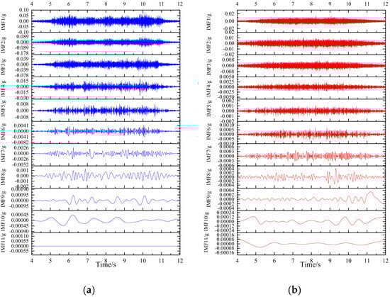 This method decomposes complex signals into a limited number of high-frequency and low-frequency components with meaningful instantaneous frequencies, whose frequency or amplitude can be modulated, and has the advantages of no prior knowledge and strong adaptability [21,22]. Since the acceleration of the tunnel wall is the most concerned, the empirical mode decomposition method is used to decompose the acceleration time-domain curves of the tunnel wall under the four working conditions, as shown in Figure 12, among them, IMF1~11 refers to the intrinsic mode function of the 1st~11th order. It can be seen that the acceleration time-domain curves of the tunnel wall under the four working conditions can be decomposed into 11 orders, and each order intrinsic-mode function of the tunnel wall at steel-spring-floating slab track vibration is smaller than the corresponding intrinsic-mode function curve of the ordinary monolithic track tunnel wall vibration. Therefore, the steel-spring vibration isolator has a weakening effect on the vibration in all frequency bands.
