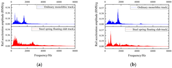 (1) According to Figure 13a, it can be seen that the rail acceleration spectrum distribution of the ordinary monolithic track and the steel-spring-floating slab track is significantly different. The peak points of the rail acceleration spectrum of the ordinary monolithic track are concentrated in the segment below 2000 Hz, and there are obvious peak points at 458.73 Hz and 1617.98 Hz. The amplitudes are 0.32 g and 0.28 g, respectively. The spectral peak points of the steel-spring-floating slab track are distributed in 0~3000 Hz, and the peak point density below 1000 Hz is greater than the rail acceleration of the ordinary monolithic track. Its two obvious peak points are located at 438.96 Hz and 2683.52 Hz, and their amplitudes are 0.35 g and 0.15 g, respectively. For the curved segment, as shown in Figure 13b, it can be seen that the amplitudes of each peak point are significantly larger than those of the straight-line segment. The maximum values of the ordinary monolithic track and the steel-spring-floating slab track are located at 1622.26 Hz and 693.99 Hz, respectively, and the amplitudes are 0.55 Hz and 0.53 Hz, respectively.