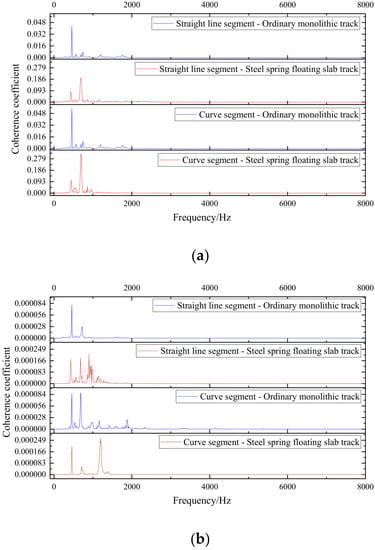 According to Figure 16b, it can be seen that the coherence curves of the track bed–tunnel wall acceleration spectrum under the four working conditions are quite different. The track bed–tunnel wall acceleration spectral coherence curve of the ordinary monolithic track has 2 significant peak points (458 Hz, 683 Hz) in the straight line segment, and the amplitude of the peak point at 683 Hz in the curved segment increases. There are two additional peak points (967 Hz, 1162 Hz, 1875 Hz). The coherence coefficient of the track bed–tunnel wall acceleration spectrum of the steel-spring-floating slab track is significantly smaller than that of the ordinary monolithic track, and its characteristic frequency bands are located at 429 Hz, 684 Hz, and 898 Hz. The characteristic frequency bands of the curved segment have changed, and are located at 459 Hz, 703 Hz, and 1191 Hz, respectively.