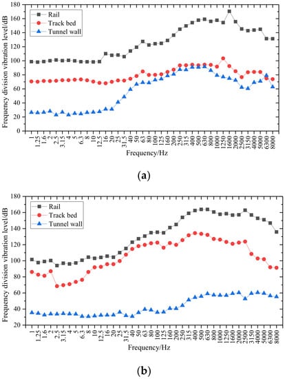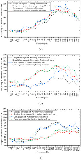 Comparison of frequency-division vibration levels of various rail components. (a) Rail; (b) track bed; (c) tunnel wall.