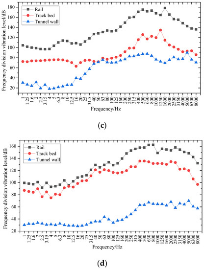 Comparison of frequency-division vibration levels for each condition. (a) Straight line segment—ordinary monolithic track; (b) straight line segment—steel spring floating slab track; (c) curved segment—ordinary monolithic track; (d) curved segment—steel spring floating slab track.
