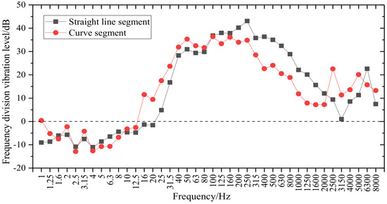 According to Figure 18b, it can be seen that in most of the segments (especially above 6.3 Hz), the frequency-division vibration level curve of the steel-spring-floating slab track is larger than that of the ordinary monolithic track, and the vibration level of the high-frequency band in the curved segment is significantly larger than that in the straight line segment. Under the influence of line conditions, the frequency-division vibration-level curve of the ordinary monolithic track for frequencies above 315 Hz has multiple peak points, which are significantly larger than those of the straight line segment ordinary monolithic track. It even exceeds the steel-spring-floating slab track at 1250 Hz, indicating that the vibration of the ordinary monolithic track is more susceptible to line conditions.
