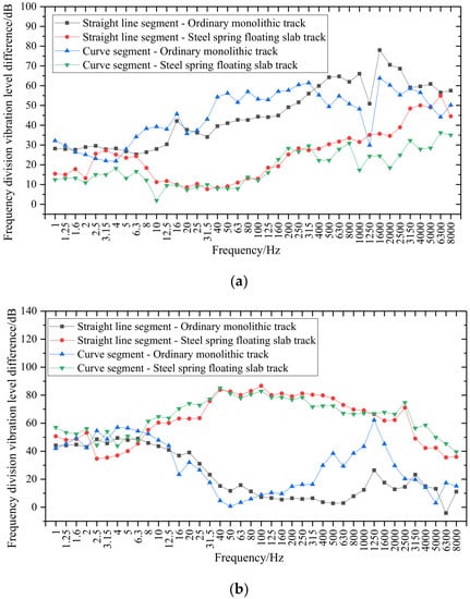 Comparison diagram of frequency-division vibration-level transmission difference of each track component. (a) Rail–track bed; (b) track bed–tunnel wall.