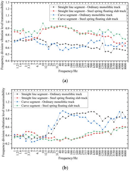 According to Figure 20a and Figure 21a, it can be seen that for the vibration-level transfer between the rail and the track bed, the vibration-level reduction of the steel-spring-floating slab track is small, that is, the vibration-level transfer rate is large. Especially in the vibration level in the 12.5~100 Hz frequency band, the vibration-level transfer rate is generally around 0.9. However, the rail–track bed vibration-level transfer difference of the ordinary monolithic track is generally larger than that of the steel-spring-floating slab track, and the vibration-level transfer rate of each frequency band is mostly between 0.6 and 0.75, and the vibration-level transfer rate gradually decreases as the frequency increases. At the same time, through the comparison between the straight line segment and the curved segment, it can be seen that for the frequency band above 400 Hz, the vibration transmission of the rail–track bed in the curved segment is significantly greater than that in the straight line segment.