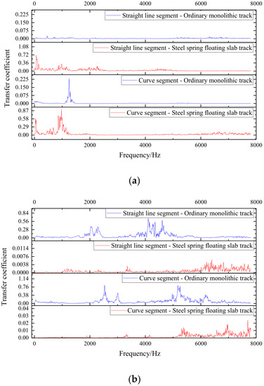 In terms of vibration transmission, the vibration transmission characteristics of the rails, track bed and tunnel walls of the steel-spring-floating slab track and ordinary monolithic track have obvious field characteristics (Figure 22). Comparing the rail–track transfer coefficient curves of the straight line segment and the curved segment, it can be seen that when passing through the curved segment, the rail–track bed transfer coefficient curves of the ordinary monolithic track and the steel-spring-floating slab track both show a new peak point at 791~1455 Hz. They are located at 1250.01 Hz and 976.56 Hz, respectively, and the transfer coefficient amplitudes are 0.233 and 0.915. Compared with the steel-spring-floating slab track, the track bed–tunnel wall vibration transfer curve of ordinary monolithic track has two peak regions in the mid-frequency region, and the peak regions are also different with the change of line conditions. The track bed–tunnel wall vibration-transfer peak at ordinary monolithic track areas in the straight line segment are located at 1806~2490 Hz and 3681~5136 Hz, and the track bed–tunnel wall vibration-transmission peak areas of the ordinary monolithic track in the curved segment are located at 2168~3134 Hz and 4912~6386 Hz. It can be seen that the frequency of the peak segment in the curved segment is higher and wider. The track bed–tunnel wall vibration transfer curve of the steel-spring-floating slab track is mainly located in the high frequency above 5107 Hz, and the peak range and peak value of the transfer coefficient curve in the curved segment are larger than those in the straight line segment, and the two main peak areas appearing in the transfer coefficient curve of the ordinary monolithic track are eliminated. The reason for the difference is that the basic setting of the track structure in the curved segment is different.