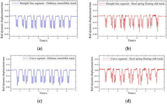 Time domain curve of rail dynamic displacement. (a) Straight line segment—ordinary monolithic track; (b) straight line segment—steel-spring-floating slab track; (c) curved segment—ordinary monolithic track; (d) curved segment—steel-spring-floating slab track.