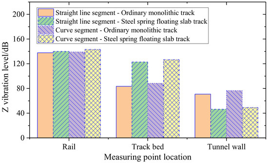 It can be seen from Figure 24 that after the vehicle speed is corrected to the same speed, the Z vibration level of the tunnel wall in the steel-spring-floating slab track segment is significantly smaller than that in the ordinary monolithic track segment. For the ordinary monolithic track tunnel wall, the Z vibration level is located at 70.83~76.54 dB. The Z vibration level of the tunnel wall at the steel-spring-floating slab track is located at 46.41~49.33 dB. The insertion loss VLZ of the straight line and the curved segment are 24.42 dB and 27.21 dB, respectively, and the average insertion loss VLZ is 25.82 dB, indicating that the steel-spring-floating slab track has a significant vibration isolation effect.