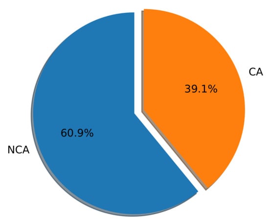 In this research, the Cyber-Troll publicly available dataset (https://www.kaggle.com/datasets/dataturks/dataset-for-detection-of-cybertrolls (accessed on 9 February 2022)) was used. Data-Turk created this dataset for aggression detection purposes. The dataset contains English language tweets, classified into two classes; cyber-aggressive (CA) and non-cyber-aggressive (NCA) by the Data-Turk society. Cyber-aggressive tweets contain messages intended to insult or hurt someone online. On the other, non-cyber-aggressive are tweets that contain no negative meaning, with no harm directed toward others. The dataset contains 20,001 tweets, of which 12,179 tweets are NCA and 7822 tweets are CA, as shown in Table 1. As depicted in Figure 1, CA tweets represent about 39% of the data while the NCA represents 61%.