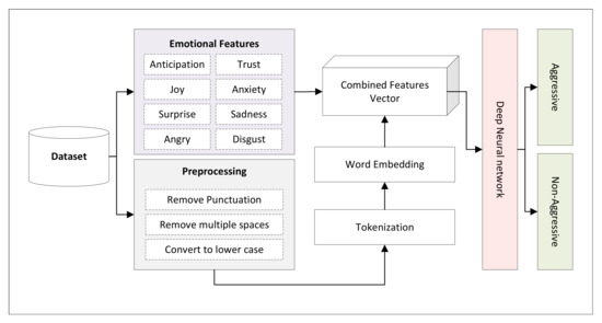 Cyber aggression detection is a fundamental problem of natural language processing (NLP). The critical part is to preprocess the data to remove unwanted text and tokenize the data for further processing. Afterward, feature extraction and selection are performed to prepare the data for input to machine learning or deep learning models. Much research has been conducted using conventional machine learning models. The study in [8] employed traditional machine learning models to perform text classification. They used support vector machine (SVM), logistic regression (LR), and naïve Bayes (NB) as classification models. The authors of [9] also performed a comparative analysis of the machine learning models. Another study [10] used naïve Bayes and SVM to identify cyberbullying in Arabic text. The limitation in [9] is that they only used textual features and basic machine learning models. However, it is difficult to achieve significant improvements in cyber aggression detection using machine learning algorithms while using traditional feature extraction methods, such as term frequency-inverse document frequency (TF-IDF), Word2Vec, etc. Identifying emotions without facial expressions and voice tones is still an operose task. Understanding emotions from textual data is difficult as there is limited text length on Twitter and the use of internet slang and sarcasm. To overcome this difficulty, deep learning involves robust models, such as the dense neural network (DNN) [10], multilayer perceptron (MLP), long short-term memory (LSTM), recurrent neural network (RNN), and convolutional neural network (CNN). As deep learning has the capability to learn deep high-level features, some variants of these networks demonstrate superior performance in text classification [11].