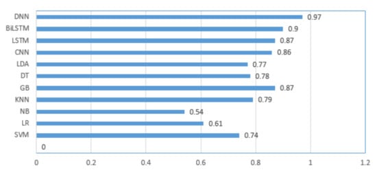 To compare the performance of the machine and deep learning models, a bar graph of the F1-score of all models trained using the combined feature set is shown in Figure 3. As the F1-score took the recall and precision into account, and the data classes were unbalanced, comparing the machine learning and deep learning models was considered. It is clear that the proposed DNN model trained by the combined features outperformed all other machine and deep learning models.
