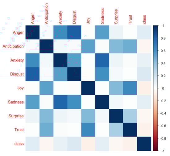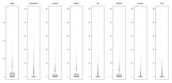 The conducted statistical analysis of the emotional features to assure its significance in the collected tweets is depicted in Table 7. The entries of Table 7 present a summary of the feature statistics in the data records, including N (the number of data records), the mean, standard deviation (), the maximum, and minimum, the 25th percentile (Q1), and the 75th percentile (Q3). The distribution of that features is explained by the aid of sketching the histograms, and boxplots, as depicted in Figure 4 and Figure 5. A histogram is a bar chart of a numeric variable divided into bins, with the height of each bin indicating the number of instances that fall into it. It is utilized to obtain a sense of an attribute’s distribution. As shown in Figure 4, the majority of the variables have Gaussian distribution. The box in the boxplot represents the middle half of the data points, the line represents the median, and the whiskers of the plots represent the feature’s reasonable range. Any dots outside of the whiskers are likely to be outliers. The correlation between all features and the prediction outcome is illustrated in Figure 6. The anger feature demonstrates a high correlation with the anxiety, disgust, and sadness features; however, the joy feature reveals a high correlation with anticipation, surprise, and trust features. As illustrated in Figure 6, the outcome does not have a high correlation with the emotional feature. The correlation coefficient is a measure of how closely two continuous variables are related. However, in this study, the response variable is categorical (aggressive and non-aggressive), and the input features are continuous. So, the association between the input features and the response can be extracted using the logistic regression [56]. Binomial logistic regression is as an example of a classification technique to predict a categorical response. Logistic regression, in an instance, estimates the probability that an emotional feature belongs to a specific outcome (aggressive and non-aggressive). Table 8 presents a statistical summary of a binomial logistic regression model that has been fit to predict the outcome based on the values of the emotional features in the tweet data records. The entries of Table 8 include an estimate, z-score, standard error, p-value, and significance of each of the coefficients returned by the regression model. The significance level is represented by asterisks and a high significance of a coefficient is represented by more asterisks. As illustrated in Table 8, most coefficients have a high significance level. The first five probabilities yielded by the logistic regression model are 0.46, 0.37, 0.53, 0.39, and 0.37, which can be considered close to 50%. To verify the adequacy of the logistic regression model, a hypothesis testing was utilized, considering a hypothesis in : , which indicates a null relationship between the response variable and the emotional features as input features. The learning model can be considered efficient if there is any hypothesis. The hypothesis testing was conducted using the ANOVA test, which yielded two performance measures, including the and residual deviance. The deviance indicates how effectively a model with only an intercept term can predict the response variable. However, the residual deviance shows how the input predictors, emotional features, can help in a good prediction of the response variable. A lower value of the residual deviance than the deviance indicates a better performance of the learning model using the emotional features. The retrieved residual and null deviance values are 20,888 and 21,407, respectively. So, the hypothesis can be rejected and the association between the emotional features in the classification of the collected tweets, if it is aggressive or non-aggressive, is ensured.