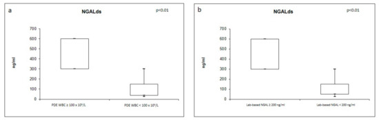 Furthermore, we split patients into two groups based on the value of white cell count in PDE. The values of peritoneal NGALds resulted in being significantly higher in PD patients (n = 17) with a peritoneal white cell count ≥ 100 × 106/L (300 ng/mL, IQR 300–600 versus 100 ng/mL, IQR 37.5–150) (Figure 1a). All patients with peritoneal white cell count ≥ 100 × 106/L had peritoneal NGALds ≥ 300 ng/mL. Only one patient with peritoneal white cell count < 100 × 106/L had peritoneal NGALds equal to 300 ng/mL.