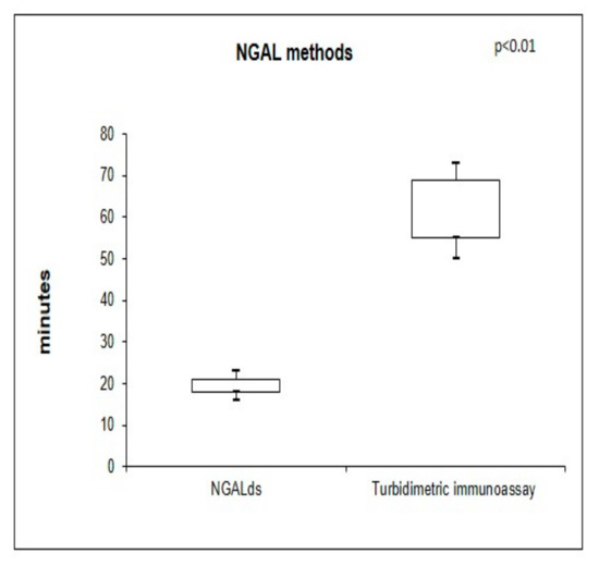 The peritoneal NGALds assay was carried out over a median time of 20 min (IQR 18–21) in comparison to the turbidimetric immunoassay performed in the median time of 65 min (IQR 55–69) (p < 0.01) (Figure 1).