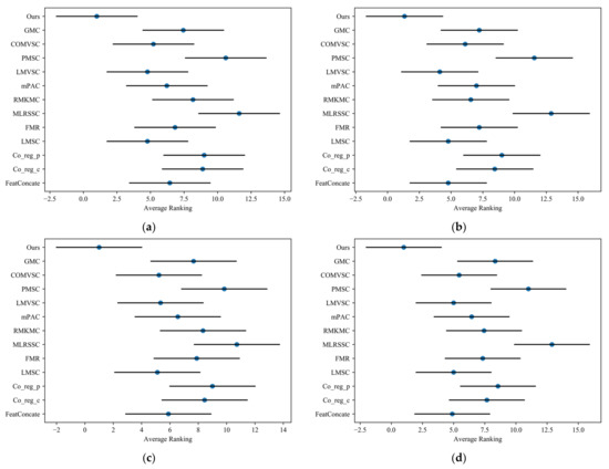 When = 0.05, the threshold for the Friedman test was 1.8544. According to Equation (14), the values can be calculated for different clustering evaluation metrics (ACC, NMI, F-score, and ARI), which are 8.4348, 13.0826, 5.9892 and 11.3655, respectively. These values are all greater than the threshold of the Friedman test, which rejects the hypothesis that all the methods being compared hold the same performance. Then, we perform the Nemenyi post-hoc test to further distinguish multiple methods. After obtaining the critical distance, CD = 6.2982, according to Equation (15), we can draw the Friedman test chart as Figure 2. For each method, the blue dot marks its average rank. The horizontal lines with the dot at the center indicate the critical distance, CD. If the lines do not have overlapping areas this indicates a significant difference in the comparison methods.