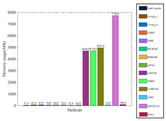 We use MATLAB 2018b to run each clustering method independently and recorded the memory usage of each clustering method. Specifically, we recorded the current matlab memory usage once before we ran the program. After the program has finished, we recorded the current matlab memory usage again. Subtracting the first reading from the second reading gives us the memory usage of the method. For example, on the 3sources data set, as can be seen in Figure 4, the memory usage of our method is small compared with the LMVSC, PMSC, COMVSC and MVSCLG methods. The memory usage of our method is slightly larger than the other remaining methods, but there is no significant difference between our method and the other remaining methods in terms of memory usage by an order of magnitude. Therefore, our method has an appropriate space complexity.