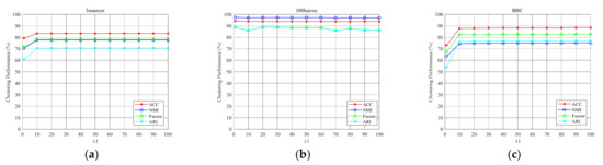In Model (5), when is large enough, the obtained common subspace representation makes zero. Hence, is satisfied. To effectively accelerate the optimization procedure, we determine the value of in a heuristic way. Moreover, in Model (5), we integrate subspace representation learning, multi-view information fusion, and clustering into a unified framework. The aim is to exploit the internal relationships of the three procedures to obtain a good clustering performance.