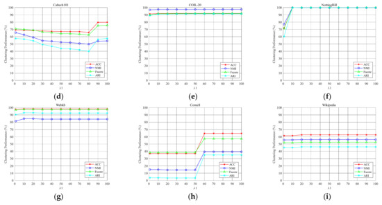 The parameter sensitivity of on nine multi-view data sets. (a) 3sources, (b) 100leaves, (c) BBC, (d) Caltech101, (e) COIL-20, (f) NottingHill, (g) Webkb, (h) Cornell, (i) Wikipedia.