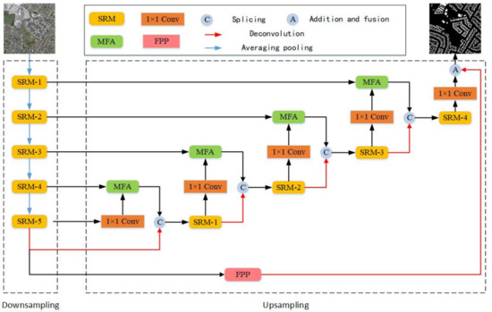 As shown in Figure 1, in order to reduce the disappearance of the gradient in the training process of the model, the deep residual learning method is used in the coding stage to extract the building features in the remote sensing image. At the same time, in order to reduce the explosive growth of parameters caused by larger convolution kernels, this paper introduces a deep separable convolution to improve efficiency and designs an SRM. In addition, in order to obtain multi-scale information of remote sensing images of buildings, this paper improves the pyramid pooling module proposed in PSPNet and designs an FPP module that is more effective in contextual attention and extracting multi-layer features. In the decoding stage, on the one hand, the SRM is used to gradually restore the spatial information to generate the final building segmentation result; on the other hand, the idea of an attention mechanism is introduced, and an MFA is designed to recover the context information learned in the coding stage from multi-scale in an aggregated manner.