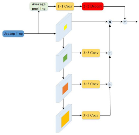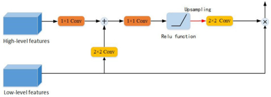 Figure 4 shows the MFA module designed in this paper. Considering that the low-level features have more pixels, the 2 × 2 convolution is performed on the low-level features to reduce the feature map channel and feature map size of the neural network, thereby reducing the amount of calculation caused by the upsampling process. At the same time, it also prepares for feature fusion with low-level features. The context information generated from high-level features is feature-fused with low-level features through 1 × 1 convolution. The fused features are subjected to 1 × 1 convolution and nonlinear Relu function, and then upsampling is performed once, and the obtained feature information is multiplied by the original low-level features.