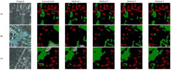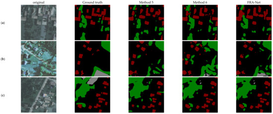 Figure 5 shows several instance results for different categories. It can be seen from the observations that the resulting map predicted by FRA-Net is the closest to the original image, whether it is for woodland, water, or buildings. The results in the third column of Figure 5 are the worst predictions for buildings throughout the experiment, with many buildings being misclassified as non-buildings. At the same time, woodland areas are also misclassified as waters in Figure 5b–d. It is worth noting that methods 2 to 6 have fewer misjudgments in this regard. Except for method 1, the rest of the model structures use the residual structure for downsampling, and the same ordinary residual block is used for the upsampling process from method 1 to 3. This also explains the effectiveness of the residual structure as an upsampling process to some extent. From the five scenarios in the figure, method 1 has the highest false-positive rate of buildings. Residential houses were misjudged due to different roof shapes when dividing houses, and flat-roofed houses were identified as non-buildings. When dividing buildings for shopping malls and factories, they will be identified as non-buildings due to the architectural pattern of the roof. In contrast, methods 2 to 4 use residual blocks to extract features during downsampling, and the false identification rate of buildings is lower. This is because the “skip structure” of the residual block is stronger than the structural gradient propagation of VGG16, and can also perform effective back-propagation, which enhances the generalization performance of the model. Therefore, it can extract effective features better than VGG16, and the feature recognition of buildings is also more accurate.